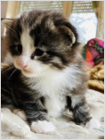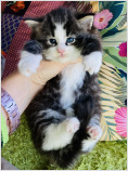 7 Wochen alt - er ist ein Herzenzbrecher! Legt sich zu mir, schnurrt, flirtet und putzt mich. Er ist inzwischen so groß, dass er kaum noch von den4 Wochen älteren Geschwistern zu unterscheidenist.